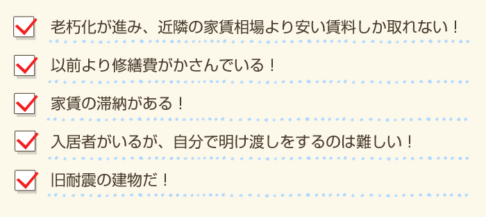 - 老朽化に伴い賃料収入が下がっていく中、年々リフォーム・修繕費が増加しがちです。
